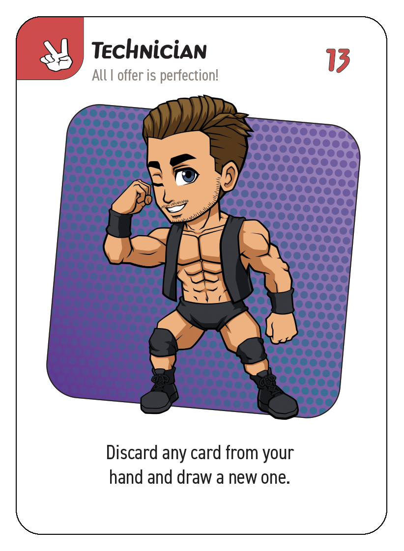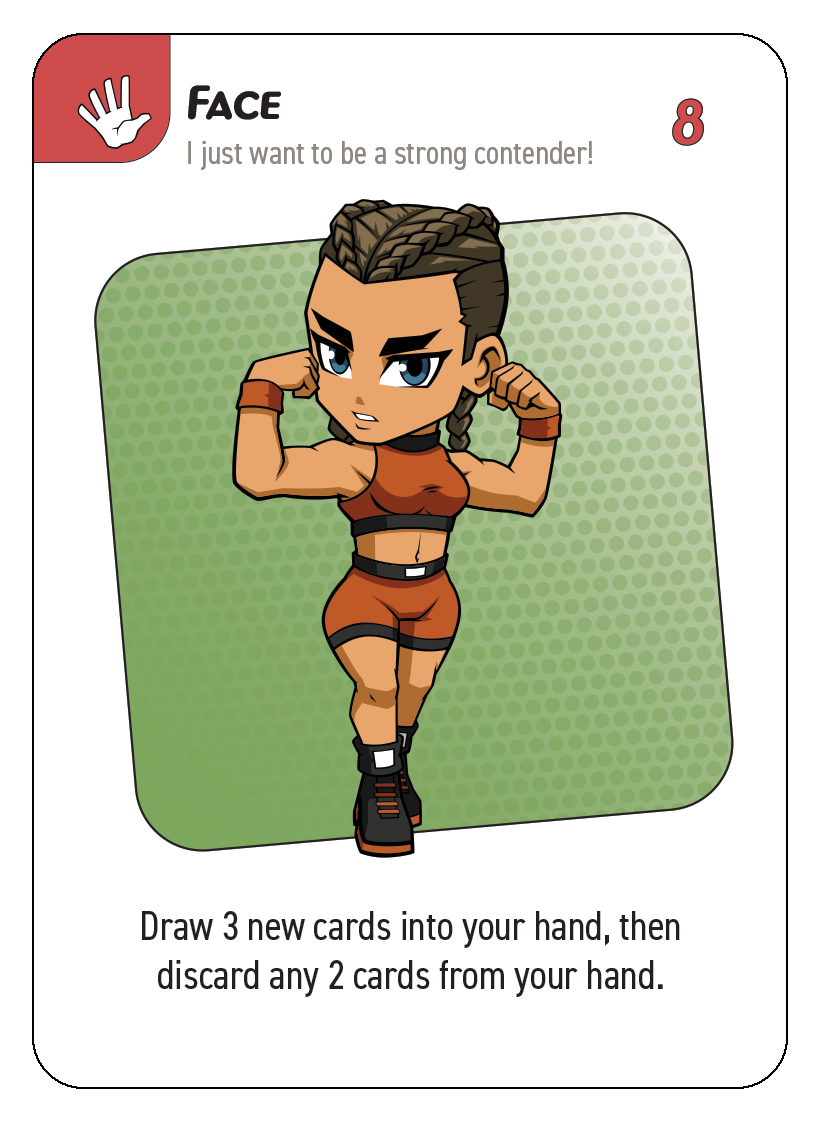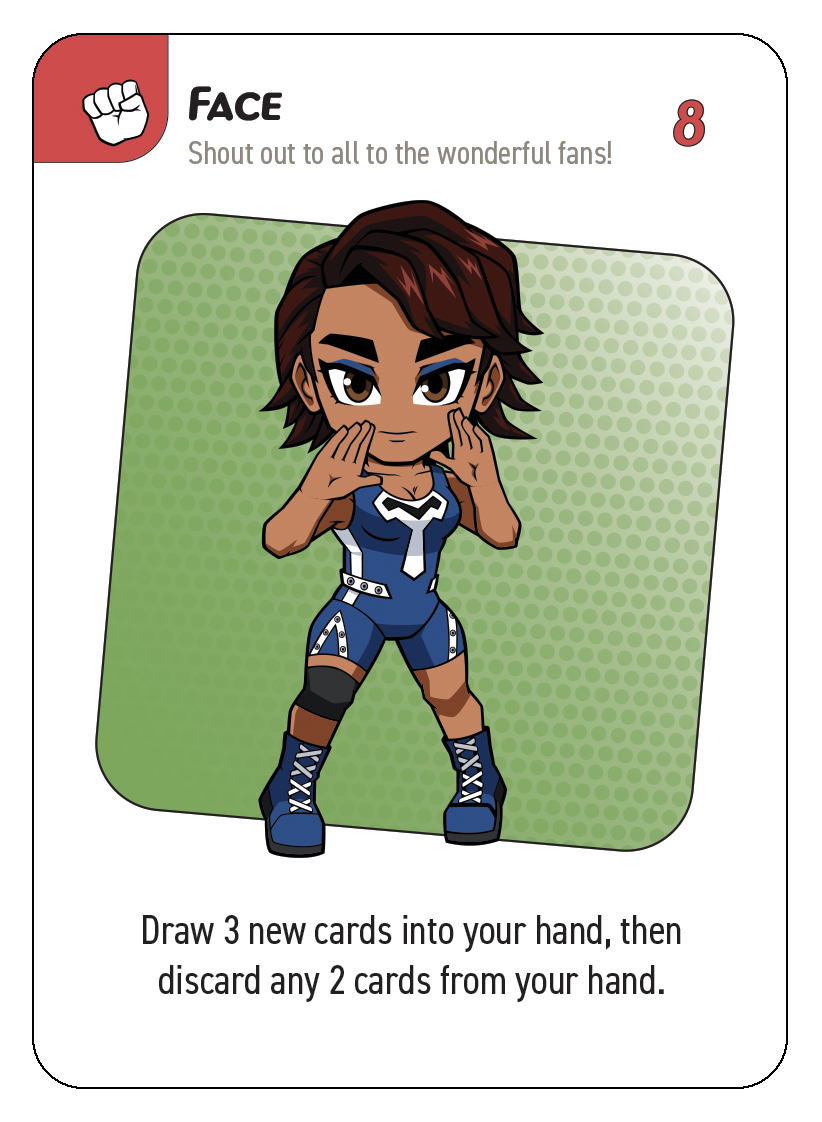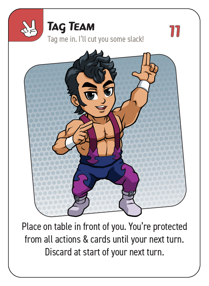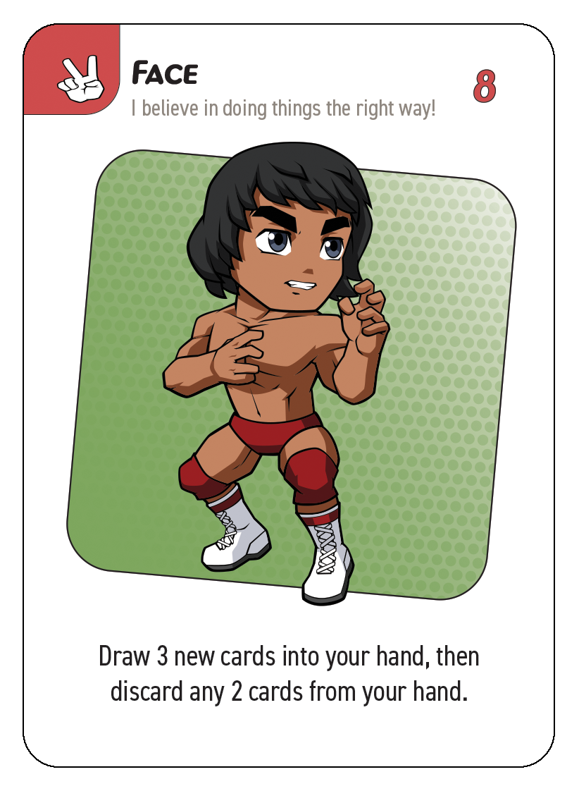 3. Draw pile: These are the un-dealt cards players will draw from at the start of each turn (or as actions require). When the title belt is revealed, this and the discard pile are shuffled back together and after that, once the draw pile is gone, each player gets one last turn to try and earn the title belt before the game ends.
