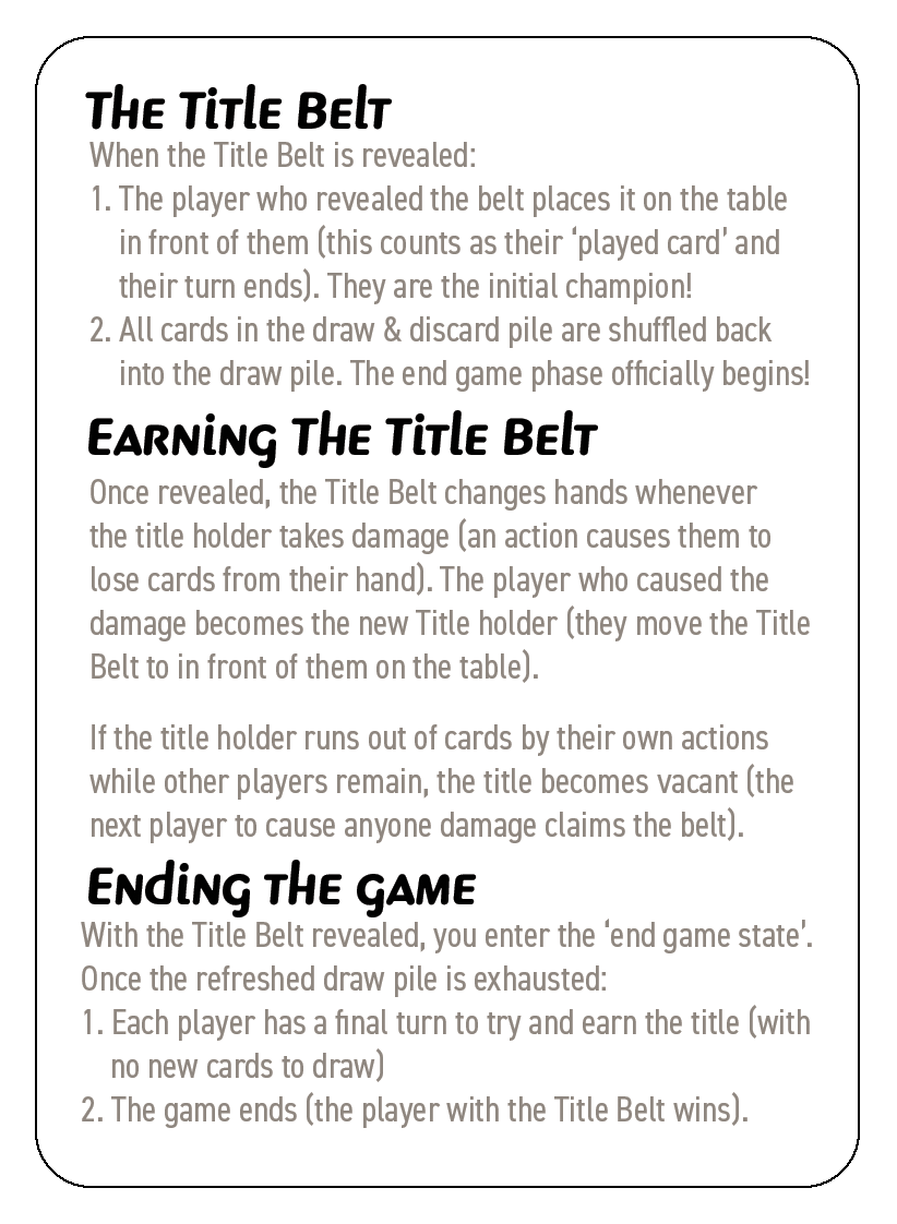 Once all cards in the deck have been drawn, each player will have one final turn to try and earn the title belt.