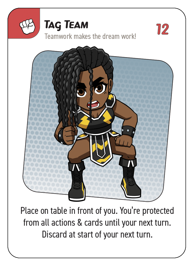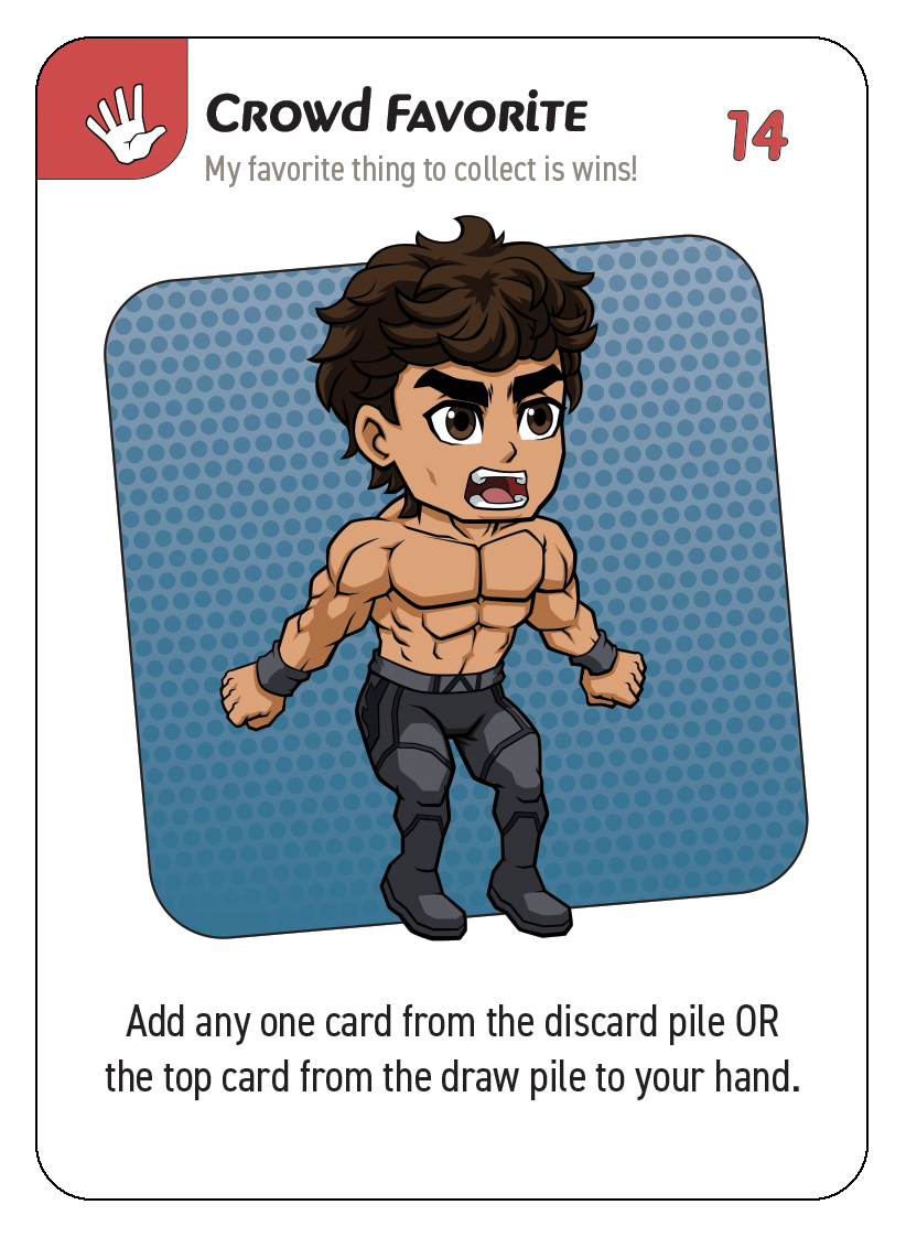3. Draw pile: These are the un-dealt cards players will draw from at the start of each turn (or as actions require). When the title belt is revealed, this and the discard pile are shuffled back together and after that, once the draw pile is gone, each player gets one last turn to try and earn the title belt before the game ends.
